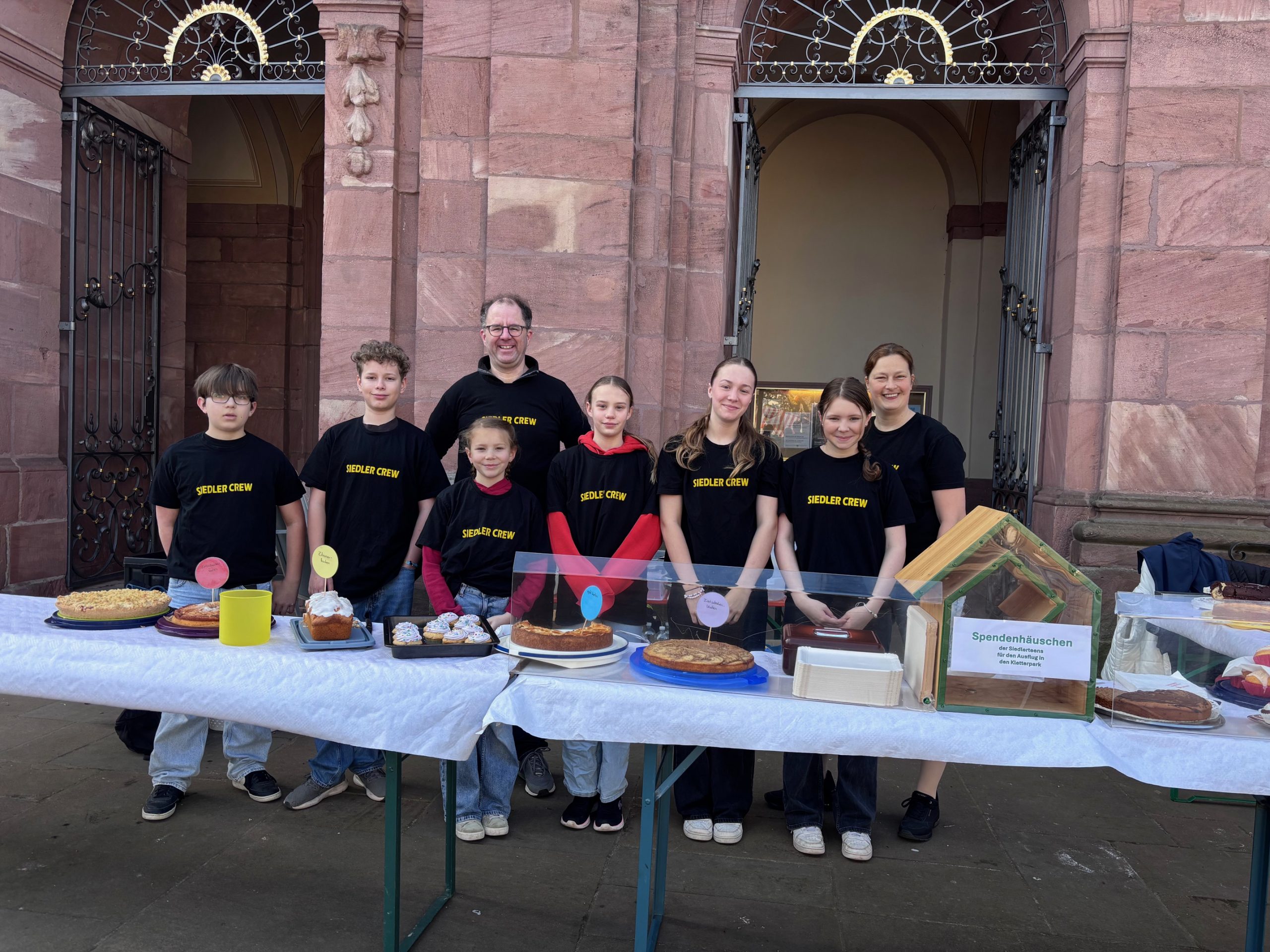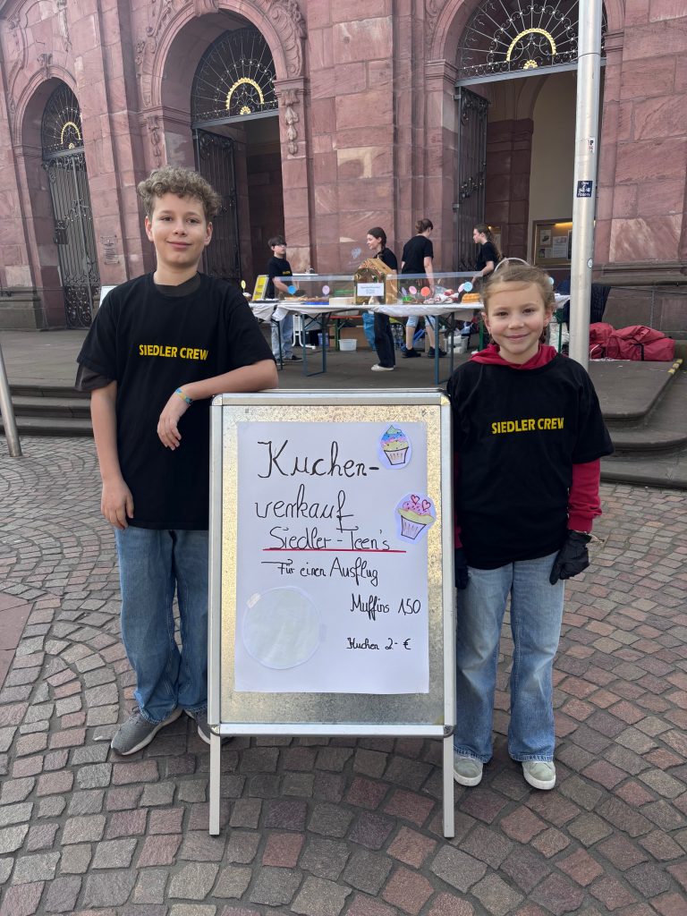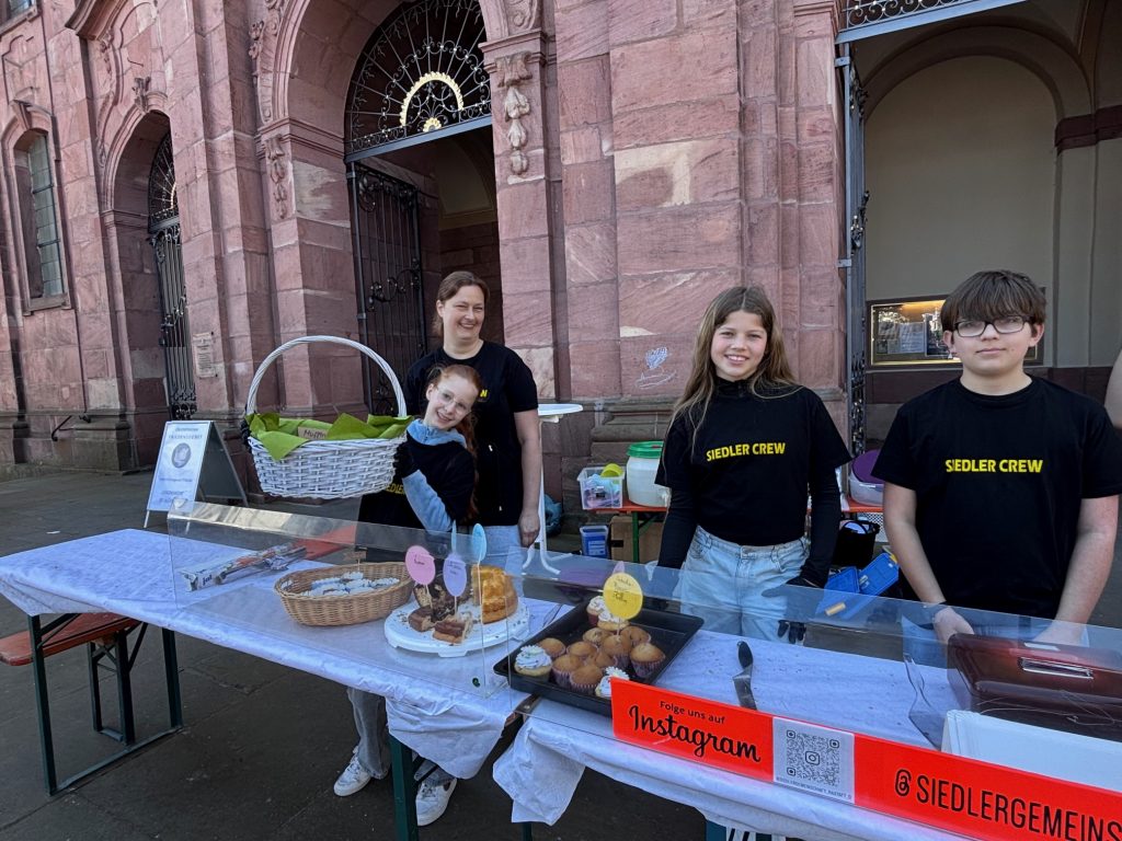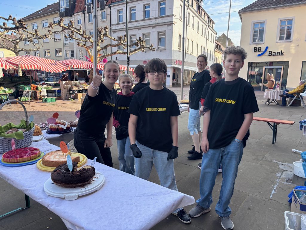 Die Jugendlichen haben dabei, mit etwas Unterstützung von Judith Deck und Stephan Friedrich, alles alleine organisiert. Es wurden Kuchen und Muffins gebacken, Plakate gebastelt und viele Siedler nach einer Kuchenspende gefragt (DANKE dafür). Auch den Auf- und Abbau samt dem Richten der passenden Materialien an den Siedler-Garagen haben die Teens übernommen. Mit dem Erlös will die Gruppe jetzt einen Ausflug in einen Kletterpark unternehmen.